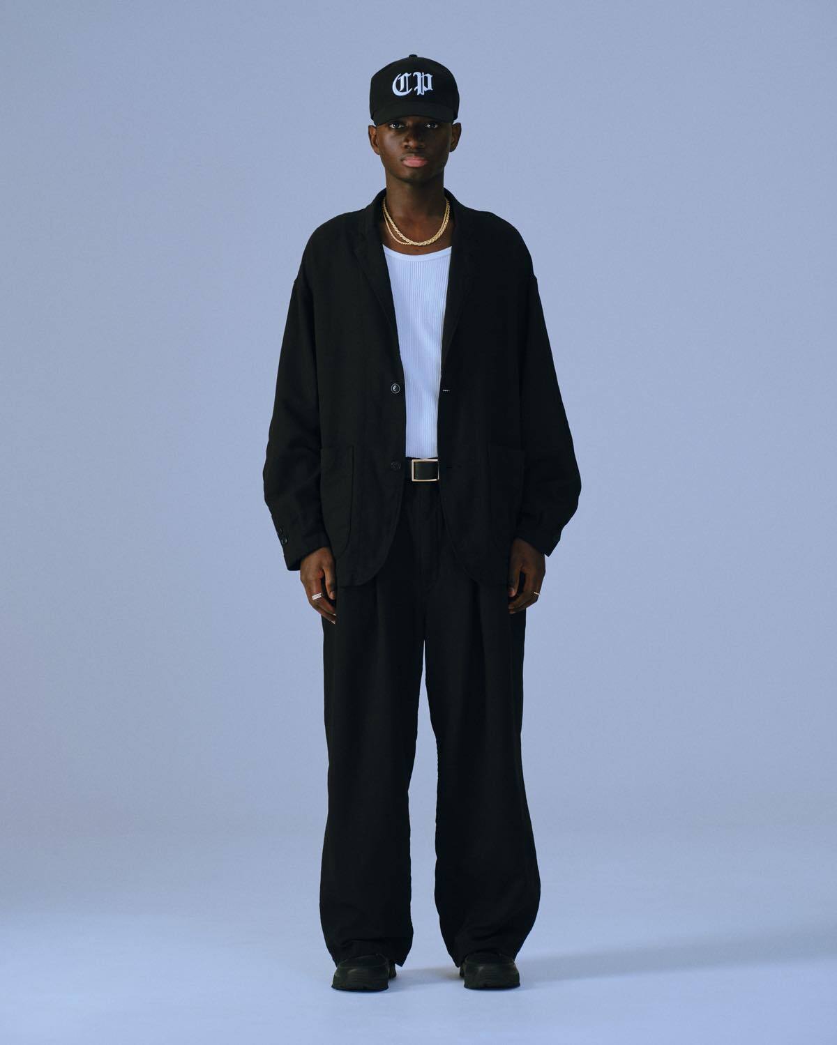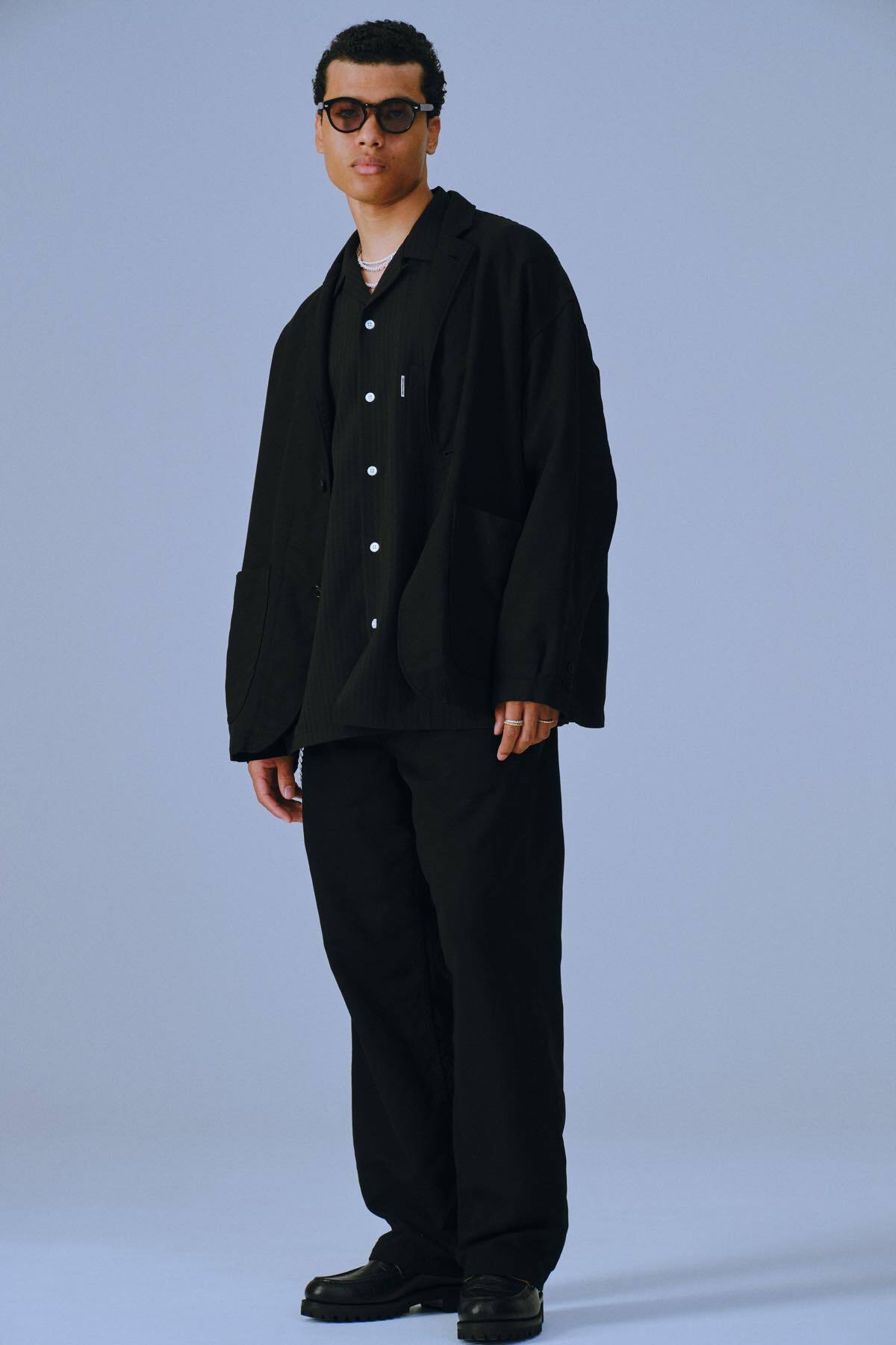 糸使いによるドライなタッチとドレープ感のある生地厚に対して軽さとソフトな風合いが特徴。ワイドシルエット。
